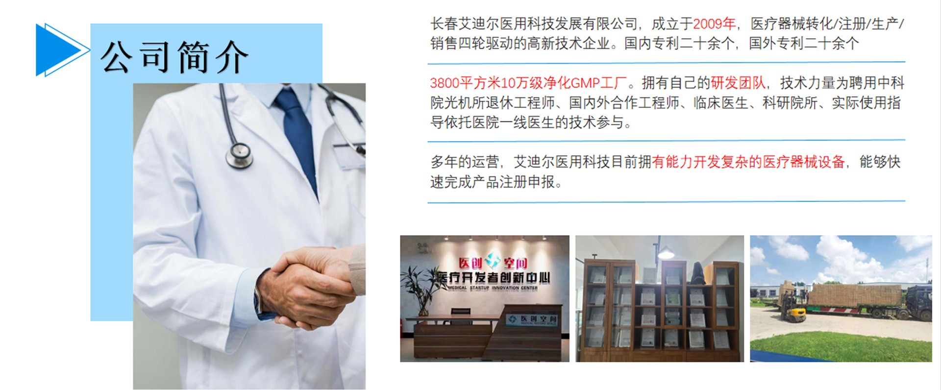 長春艾迪爾醫(yī)用科技發(fā)展有限公司為集產(chǎn)(自有工廠); 學(xué)(多所院校科研課題合作單位);研(研發(fā)成果轉(zhuǎn)化注冊)三位一體的高新技術(shù)企業(yè)。艾迪爾科技主要經(jīng)營范圍為一次性醫(yī)療器械耗材的開發(fā),專注于抗菌肽新材料的開發(fā)和研制,以“IN-58抗菌肽一類新藥及原料藥注冊、激光類治療儀”兩個核心優(yōu)勢技術(shù)為中心。公司擁有標(biāo)準(zhǔn)GMP車間及健全的質(zhì)量管理體系,擁有多個已上市和即將上市的產(chǎn)品,包括睡眠、泌尿、口腔、肝膽、消殺、婦科六大系列產(chǎn)品線。公司擁有核心專業(yè)技術(shù)報批團(tuán)隊,承接國內(nèi)外醫(yī)療器械專項成果轉(zhuǎn)化,具備自主研發(fā)能力及MAH服務(wù)能力。